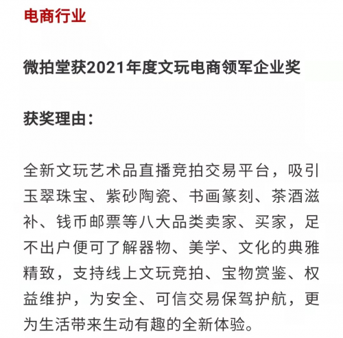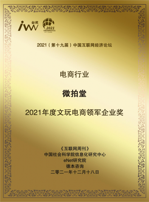 近日,由中国科学院旗下的权威媒体《互联网周刊》主办、中国社会科学院信息化研究中心、eNet研究院、德本咨询联合举办的“2021(第十九届)中国互联网经济论坛”在北京举办,微拍堂与平安、斗鱼等知名品牌一齐入围“年度金i奖”榜单。作为文玩电商头部品牌,微拍堂凭借领先的行业规模、强劲的业务增长动力、出色的科技创新能力,获得“2021年度文玩电商领军企业奖”的殊荣,成为唯一上榜的文玩电商品牌。