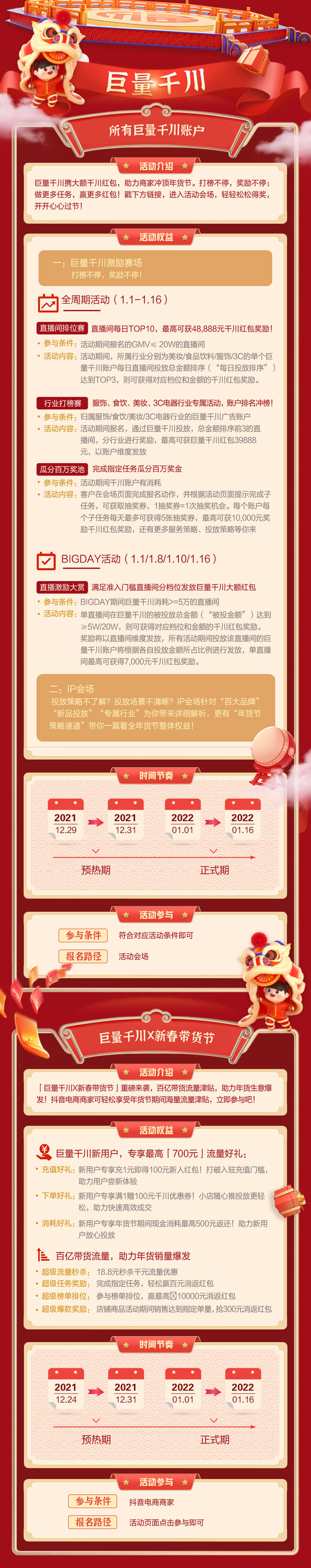 抖音好物年货节将于2022年1月1日正式开始,并于1月16日结束。活动期间,抖音好物年货节还将推出好物直播间、家乡年货短视频争霸赛、全民任务赛、巅峰任务赛等多种玩法及平台技术服务费限时返还、百亿补贴等多重运营支持政策,帮助合作伙伴快速达成销售目标。
