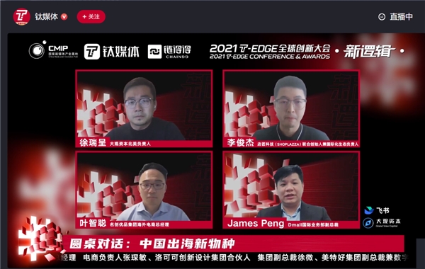12月9-10日,钛媒体“2021 T-EDGE全球创新大会”在北京大兴举办。在以“中国出海新物种”为主题的圆桌论坛环节,大观资本北美负责人徐瑞呈、店匠科技(SHOPLAZZA)联合创始人兼国际化生态负责人李俊杰、名创优品集团海外电商总经理叶智聪、Dmall 国际业务部副总裁James Peng,从资本、SaaS服务商、品牌商出海等不同视角,带来了一场关于企业出海的精彩观点碰撞。