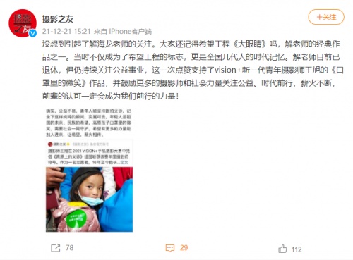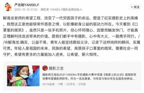 在义诊过程中,王旭用手中的vivo X60 Pro+捕捉到了土登卓玛回眸的瞬间,这张照片在11月20日世界儿童日由慈善组织发布之后,迅速引发网友的热议。即使戴着口罩,土登卓玛脸上隐隐的笑意和眼神中传递出的希翼,也让不少人深受触动。解海龙在转发分享时,将这张照片命名为《口罩里的微笑》,并表示希望能有更多的人由此关注到高原义诊和高原唇腭裂儿童。