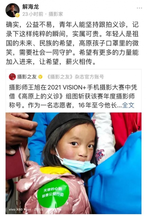除了《口罩里的微笑》之外,王旭的《高原上的义诊》组图还记录了很多高原患者与义诊医生的故事。随着vivo 2021 VISION+手机摄影大赛获奖作品的公布,《高原上的义诊》引发了更多人的共鸣,也让人们看到了影像改变高原儿童人生的力量。如今,解海龙依然在为“希望工程”奔走,王旭也仍会以摄影志愿者的身份纪录高原义诊。影像的故事,还将继续。