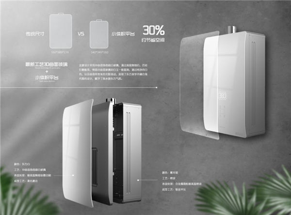 无边界简约外观设计温润如玉,改变了热水器的一贯机械感的形象,通过自然美学的圆角以及曲面玻璃的元素,更加亲近消费者,平滑细腻的一体式面板,也使东方美学更好融入家居环境当中。小体积SPA浴以及宝宝浴是本机主要特色,SPA浴模式通过快速精准调节水的温度,达到按摩功效。宝宝浴模式通过精准出水,定量定温来实现细致的关怀。机器同时搭载了自主研发水增压技术,让出水量更大。另外机器配备鸿蒙系统,通过手机触碰标识即可实时连接热水器,实时了解用水量和用气量。