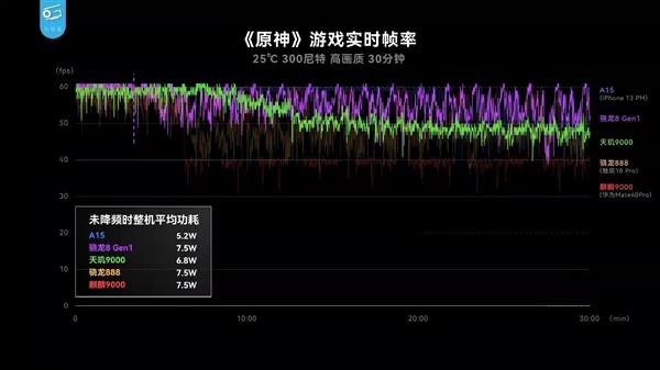 在《原神》游戏测试中,天玑 9000功耗和稳帧表现均领先新骁龙8(图/网络)