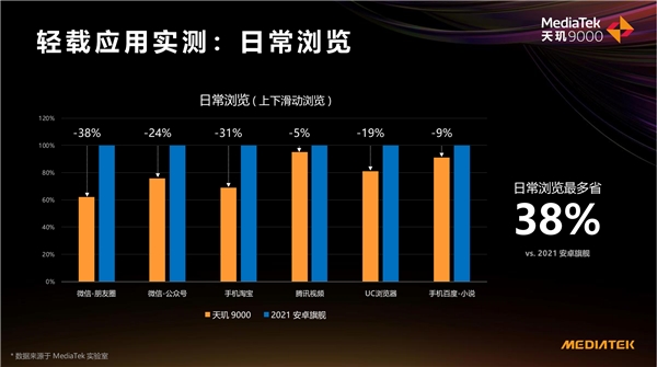 从联发科给出的数据看来,在轻载应用场景下,相比某2021年度旗舰,天玑 9000最多可节省多达38%的耗电。而在拍照、录像等中载场景下,则分别可节省9%和12%的耗电。整体来看,日常功耗表现相当出色。