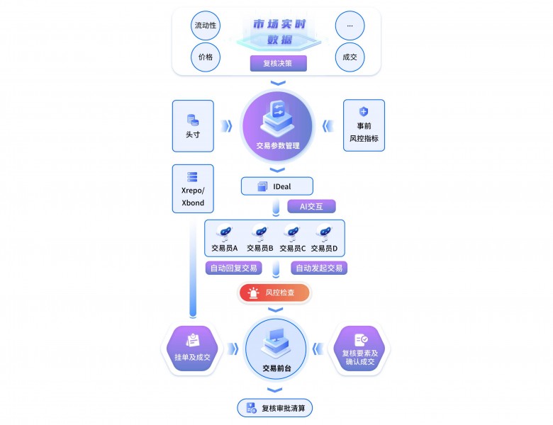 恒天FICC业务团队研发的OMS产品,全新升级智能交易管理子系统,运用自然语言处理(NLP)、深度学习等AI技术可智能完成包括现券、质押、同业存单等多个交易品种的自动询价回复和交易达成。可基于业务场景分析进行智能询价回复、自动识别交易意图,实时监测事前风控指标和自动处理交易前台,有效减少了交易员重复、繁重的询价工作,同时时刻待命,秒级回复对手方客户询价,重塑交易体验!