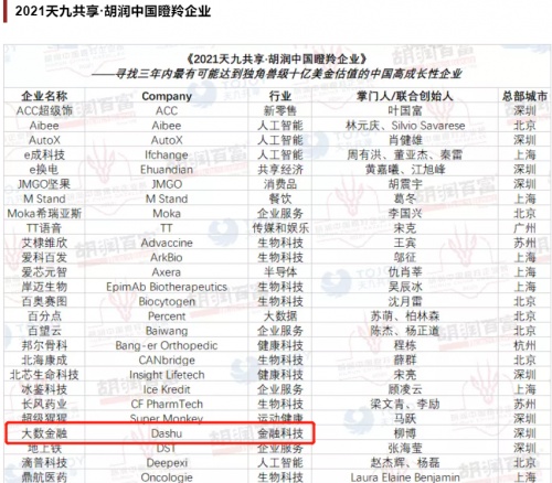 2021年12月2日,由胡润研究院发布的《2021胡润中国瞪羚企业》榜单公布,我国领先的信贷科技解决方案提供商大数金融与100余家新兴企业一起荣登榜单,被认为是三年内最有可能成为独角兽的中国高成长性企业之一。