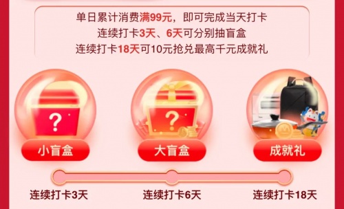 首先是连续消费签到:消费积累天数越多,就能解锁价值更大奖品的抽奖机会。成就礼作为终极大奖尽管诱人,但是满签的难度也是不小,尽管 99 元门槛不高,但是难在连续不断 18 天。打卡三天和六天大小盲盒,没准是很多「打卡健忘症」的优选。