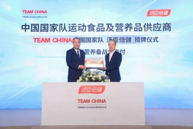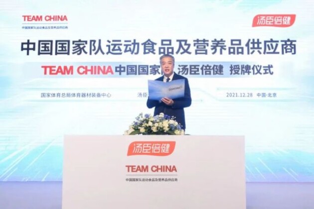 2021年12月28日,国家体育总局体育器材装备中心授牌宣布,汤臣倍健成为TEAM CHINA中国国家队运动食品及营养品供应商,为国家队70余支队伍的运动员供应运动食品、营养品和专业营养备战方案。