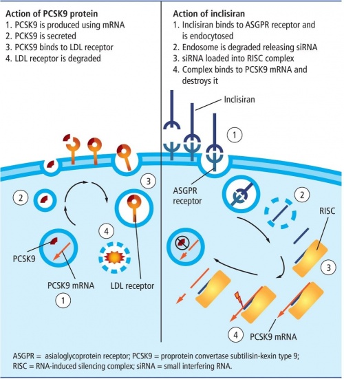 Inclisiran小核酸链可与编码PCSK9蛋白的mRNA结合,通过RNA的干扰作用来防止肝脏生成PCSK9蛋白。降低体内PCSK9蛋白水平可以从血液中清除低密度脂蛋白LDL-C。