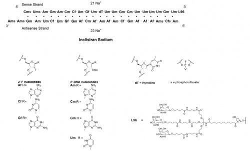 以诺华Inclisiran化学结构为例(图1),其Sense链由21个全化学修饰的核苷组成,并在核酸链的5’端连接了L96—— GalNac缀合物,其Antisense链由23个全化学修饰的核苷组成。该药物的44个核苷原料单位均不是天然siRNA的核苷,其核糖环进行2’-OMe和2’-F取代化学修饰,并在多个磷酸二酯键上进行了氧硫代修饰。