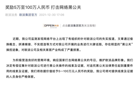 比亚迪和欧派家居均表示,即日起决定开始征集有关黑公关操作的线索及证据,经查证属实以及相关司法机关认可的,将依据价值奖励5万至100万人民币。