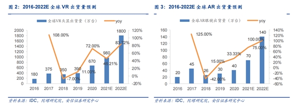 据IDC预测,全球VR设备和AR设备有望在2022年迎来全面爆发,出货量有望从980万台和70万台,飙升至1800万台和140万台,预计增速将达84%和100%。