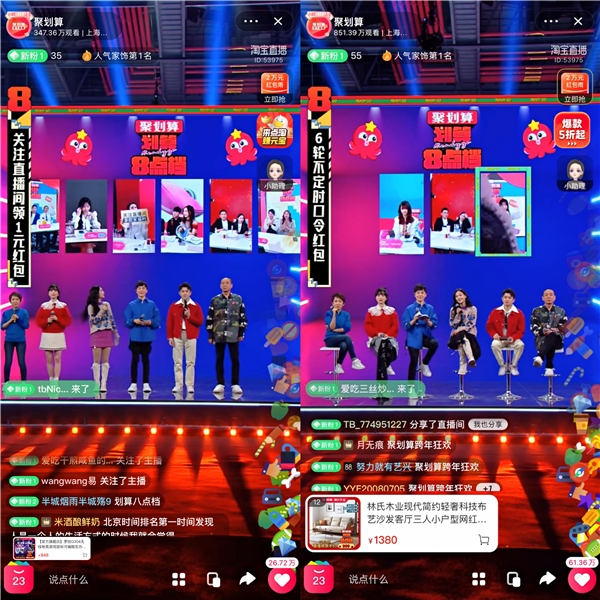 《划算8点档》是聚划算跨年狂欢重磅推出的直播栏目,也是聚划算在内容直播上的新尝试。本次首推官店联播模式,通过数位艺人齐聚聚划算官方直播间,与多个品牌直播间连麦互动的方式,构建1带N的流量输送场,激活站内流量;同时通过综艺PK玩法的加持,结合各大品牌的爆款产品和极致权益,打造极具观赏性的趣味内容,引爆外围话题。