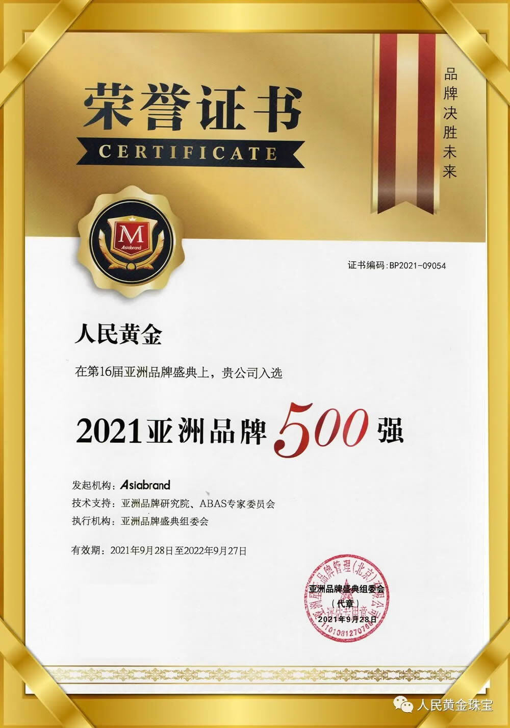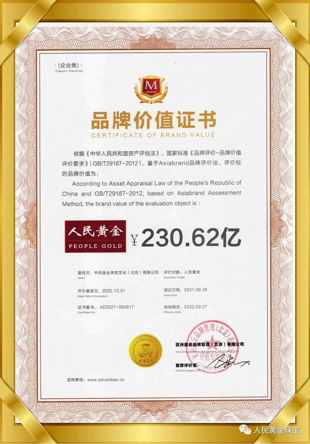 在盛典公布的“2021亚洲品牌500强”中,在今年亚洲品牌价值榜评估中,【人民黄金】品牌价值达230.62亿元顺利进入榜单。这充分说明,【人民黄金】近年来不断提升品牌形象,打造深入人心的品牌获得了社会各界个广大用户的广泛认可。