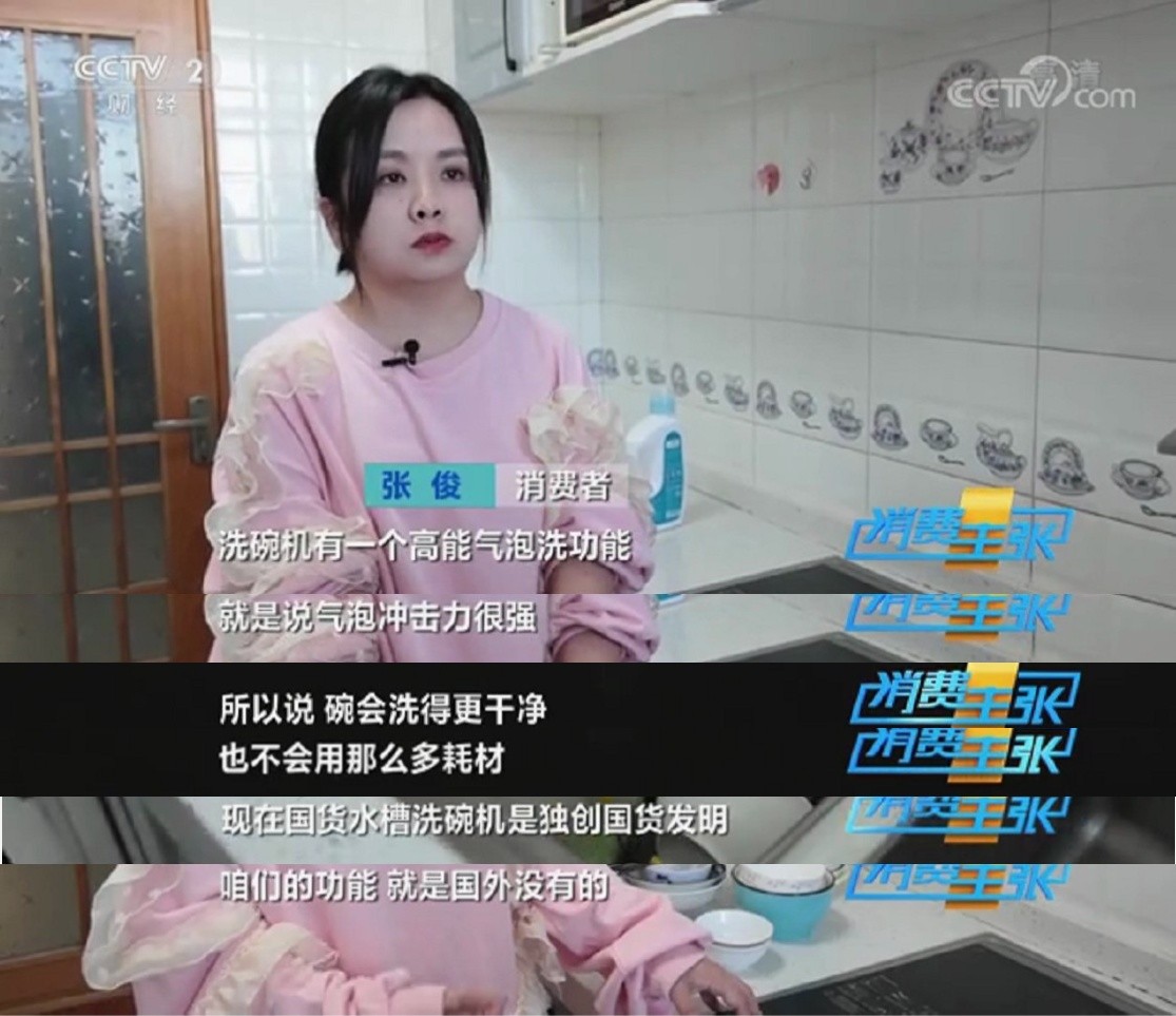 在央视记者的走访中,张女士介绍,她家的国产洗碗机不占用其他橱柜的地方,不用弯腰,并演示了洗碗机的使用步骤和清洗效果。不仅使用简单,而且洗得更干净,省时省力,所用耗材还少。她还特别强调,这款洗碗机的高能气泡洗技术是国货独创发明,许多功能是国外品牌没有的。
