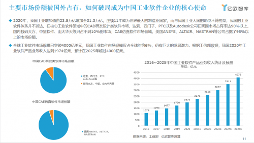 据亿欧智库数据显示,在CAD研发设计软件领域,2018年我国研发设计类软件市场80%被国外公司主导,其中达索和西门子的市场占有率分别达到12.6%和11.7%,生产控制类软件超过60%份额、信息管理类软件超过10%份额同样为国外产品占据。此外,我国全球工业软件市场竞争更处弱势地位,2020年我国工业软件全球市场份额仅为6%,与我国制造工业全球30%的占比,显得极不相称。