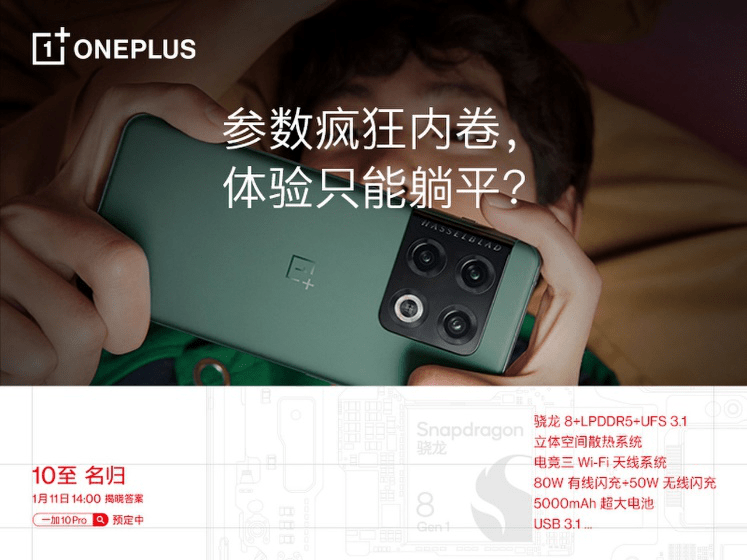 1月5日,一加手机官方进一步揭晓了新机一加10 Pro的配置:硬核四件套骁龙8 +LPDDR5+USF3.1+USB3.1,五重材料空间散热系统,以及电竞三WiFi天线,一加将一如既往通过对细节的极致打磨,带来全方位升级的性能体验,树立性能旗舰新标杆。