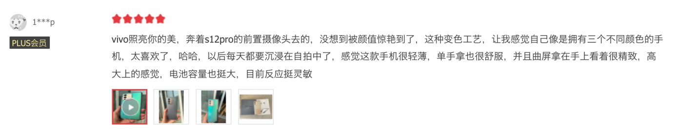 在vivo京东自营官方旗舰店中,vivo S12系列的好评率达到了98%。凭借前置5000万柔光双摄、7.36mm机身的轻薄手感以及全新的光致变色2.0后盖设计,vivo S12系列受到了首批用户的一致好评:高颜值、拍照清晰、手感好、电池耐用等评语进一步佐证了vivo S12系列全面出色的产品力。
