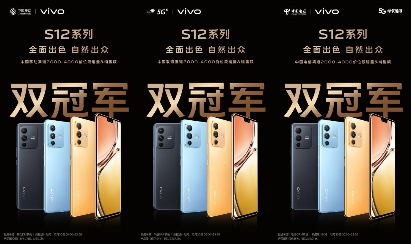 2021年12月30日,vivo S12系列正式开启首销,当日便夺得了迪信通、国美、京东五星电器、苏宁易购等多渠道2000-4000元价位段销量、销售额双冠军;同时斩获京东安卓手机全价位、天猫手机行业销量、销售额双冠军。