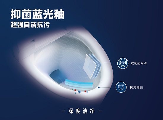 釉面致密光滑,在超高倍(>200)显微镜下观察,无微细孔。因此,污渍难以粘附,细菌不易繁殖,具有超强的抗污自洁能力。通过抑菌蓝光釉、抗菌材质、水路3重自洁、G3双擎冲洗等技术,大大提升了坐便器的洁净能力。