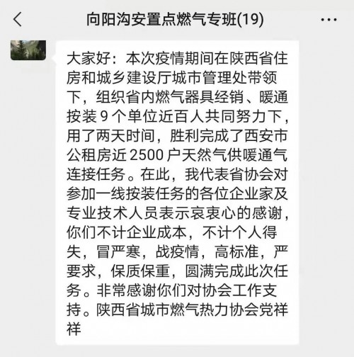 凭借多年的丰富经验,突击小组成员自带专业工具,发扬万和“细致无忧”的服务理念,听从专班领导小组安排,保质保量地完成了防疫期间的供暖保障任务,获得陕西市城市燃气热力协会的认可!