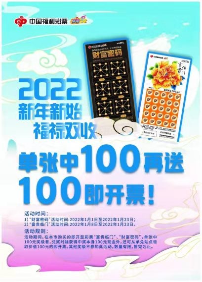 2022年1月1日至1月23日期间, 在本市购买即开票“财富密码”,单张中100元奖级者,兑奖时除获得中奖本身100元现金外,还可从承兑站点领取价值100元的即开票。其他奖级不参加此活动。