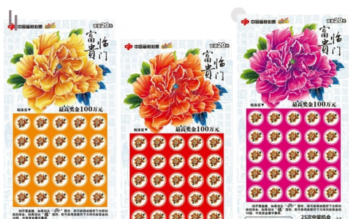 富贵临门彩票单张面值20元,最高奖金100万元。这款彩票共有3款票面,分别以黄、红、紫作为主色调,采用金银卡纸印制,凸显了牡丹的高贵品质。如果刮出“牡丹”图符,即可获得该图符下方所对应的奖金;如果刮出“福”图符,即可获得该图符下方所对应奖金的10倍。中奖奖金兼中兼得。