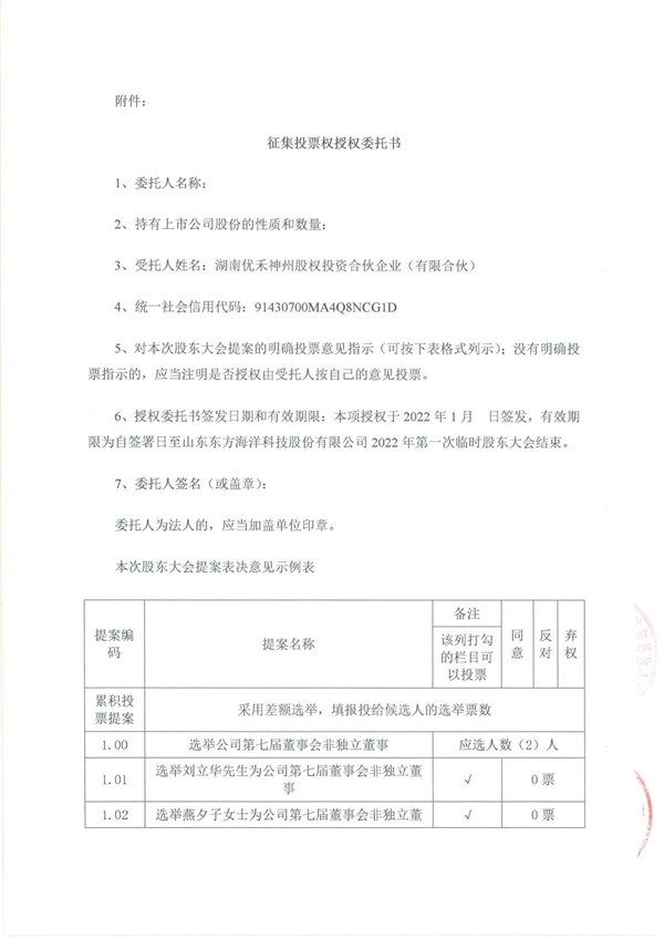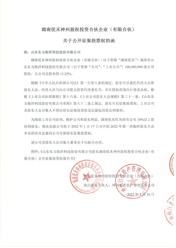 1月7日,山东东方海洋科技股份有限公司(证券简称“ST东洋”)发布《关于股东提请增加股东大会临时提案》公告。公告显示,其持股10%以上股东湖南优禾神州股权投资合伙企业(有限合伙)(以下简称“湖南优禾”)提请上市公司2022年第一次临时股东大会增加临时提案,临时提案主要内容为提请增加选举刘建平、柴俊林为第七届董事会非独立董事。1月10日,湖南优禾对外发布《关于公开征集投票权的函》,函中表示,为进一步完善公司的内部治理结构,湖南优禾提请选举柴俊林为ST东洋第七届董事会非独立董事,并向全体股东征集投票权。