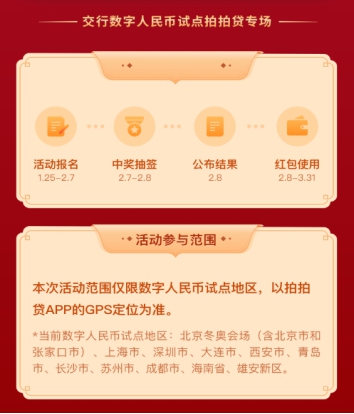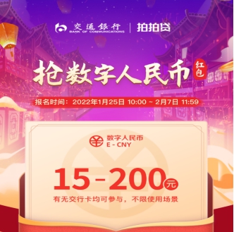 此次拍拍贷联合交通银行开展的数字人民币活动将于1月25日上午10点拉开序幕,最终于2月8日晚上8点公布抽签结果。活动期间,数字人民币试点地区的用户可在拍拍贷APP指定活动页面参与报名,报名成功且中签用户可根据指引下载数字人民币APP并开立交通银行数字人民币钱包,即可获得15元-200元不等的数字人民币红包。该红包在可受理数字人民币支付的线上场景和线下商户选择交通银行数字人民币钱包时使用。