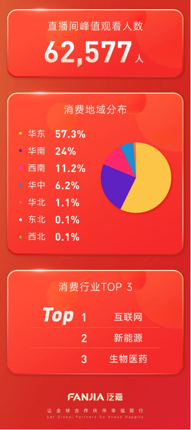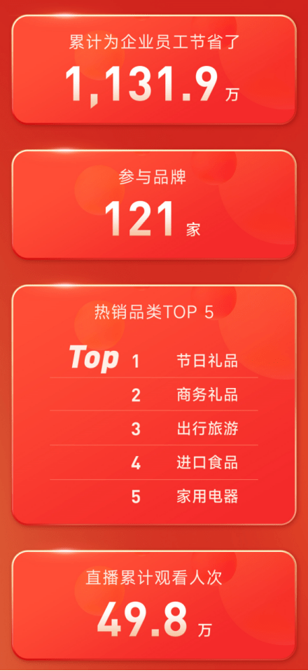 据悉,年货节总成交金额4127.5万元,总订单量156782笔,专场直播累计观看人数49.8万,最具消费力的城市则集中在华东区域,热销品类TOP5是节日礼品、商务礼品、出行旅游、进口食品、家用电器,而最具购买力行业TOP3是互联网、新能源以及生物医疗。