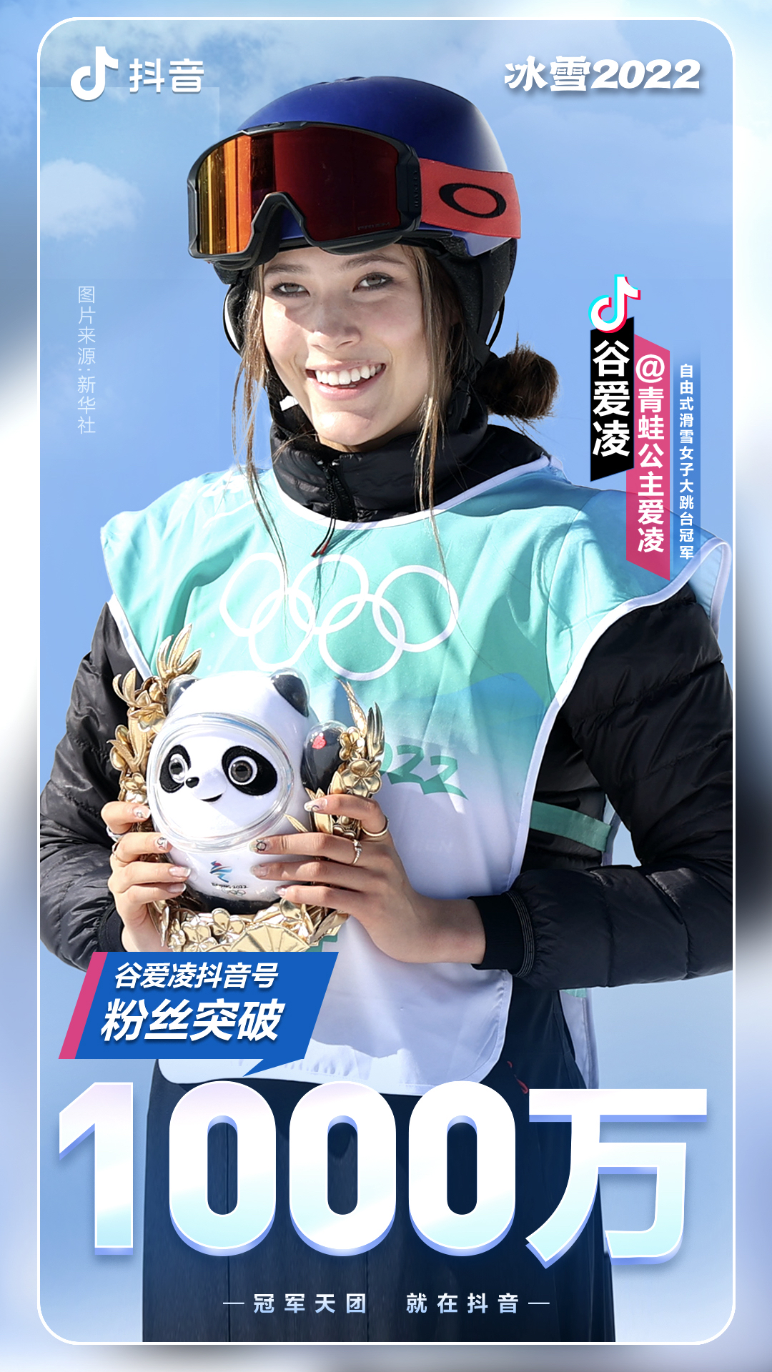 2021年10月26日,在2022北京冬奥会倒计时100天之际,自由式滑雪运动员谷爱凌以“青蛙公主爱凌”为名,正式入驻抖音。