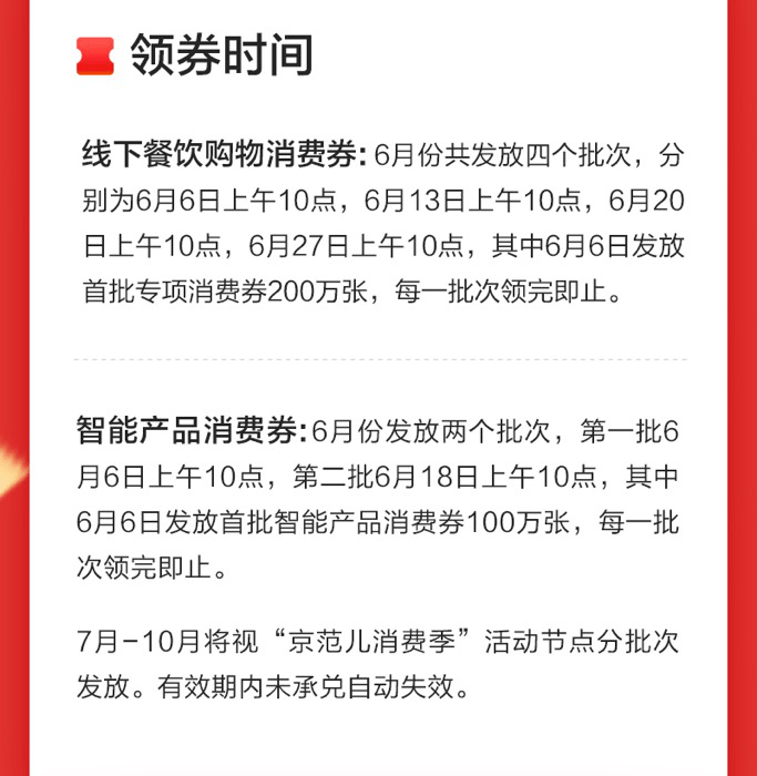 最最重要的一点是领券时间需要注意,6月份线下餐饮购物消费券共发放四个批次,分别是6日、13日、20日、27日,每天上午10点开启领券,千万不要错过。其中,即将到来的6月6日将发放首批专项消费券200万张,每一批次领完即止。而智能产品消费券则在6月份发放两个批次,第一批100万张将在6日上午10点发布,第二批是18日上午10点,每一批次同样是领完即止。每张消费券的有效期是14天,有效期内没有使用的将过期失效啦!
