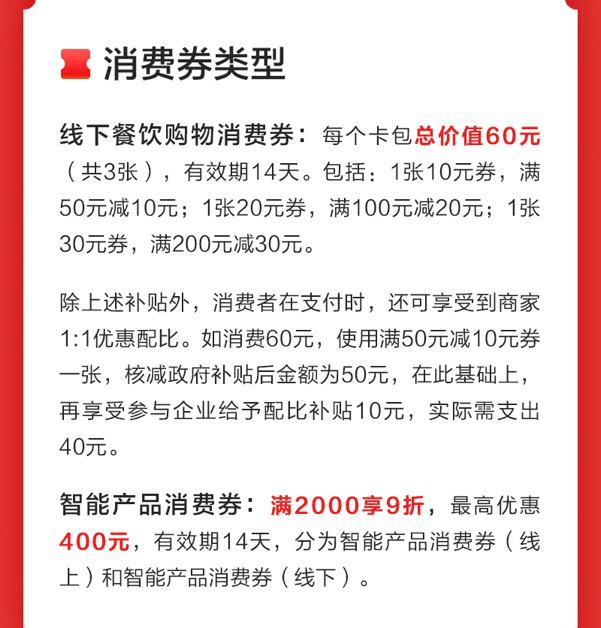 另一种消费券是智能产品消费券,对应的是大家想要购买的大件科技产品,比如智能通讯、智能家居、智能家居、智能家装四个领域的产品,消费满2000即可享受9折优惠,最高优惠400元。
