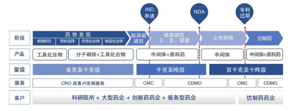 皓元医药的业务覆盖了药物研发到生产的各个阶段,形成了“分子砌块和工具化合物+特色原料药和中间体”一体化的业务模式。分子砌块和工具化合物主要在药物发现及临床前研究阶段提供毫克到千克级的产品和技术服务;中间体和原料药业务主要对应临床申报和临床试验阶段的CDMO服务,以及合成工艺开发、工艺优化和原料药注册申报等技术服务,并提供药品商业化所需的百千克到吨级的原料药和中间体产品。