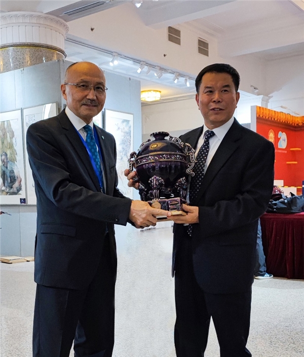 上海合作组织秘书处副秘书长特使阿泽姆巴基耶夫交接国礼钧瓷《上合樽》