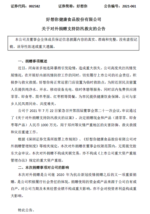 据悉,因连续遭遇汛情及疫情,河南多数企业目前正处于复工复产期。汛情本就对当地企业造成了生产经营方面的损失,随后的疫情更是加剧了市场经济下滑,进一步扩大了企业损失。中国红枣第一股好想你负责人表示:“好想你内部多个地方被雨水侵袭,生产区域设备、博物馆设备、原材料、厂房基建及设施、门店等区域都有受损,根据不完全统计受损近600万元。” 在自身受灾受损的情况下,好想你克服重重困难捐款捐物,并组织救援队赶赴一线支援。据好想你披露的“对外捐赠支持防汛救灾”公告显示,本次汛情好想你捐赠现金和产品(清菲菲、即食枣等产品)人民币1000万元,用于郑州等灾情严重地区的灾害防御、救灾救援和灾后重建工作。
