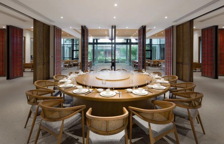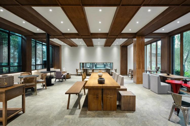 园林移步异景,引人入胜。待进室内时,又入一层佳境。「漫戈塔·天榕庄」空间设计灵感来源于陶渊明的《归园田居》诗中意境。材质上以桑竹、藤条、蔓草、园木等为核心元素,取之自然、隐于自然。桌椅、墙体、天花等采用大面积木饰,保留朴拙的脉络,给人以古朴恬静之感。