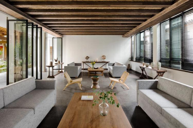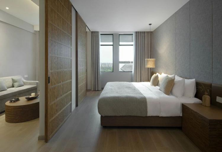 前一刻赶路时的风尘仆仆,抑或游玩时的纷纷攘攘,这一刻在这里停下来、静下来。这便是「漫戈塔·天榕庄」“修心之境”的巧妙之处。长廊环绕水庭院,连接内外,将建筑与自然的物理边界打破,所见之处皆为景。蜿蜒的玄关通道如山间曲径,顺势引向柳暗花明又一“景”的豁然感官。