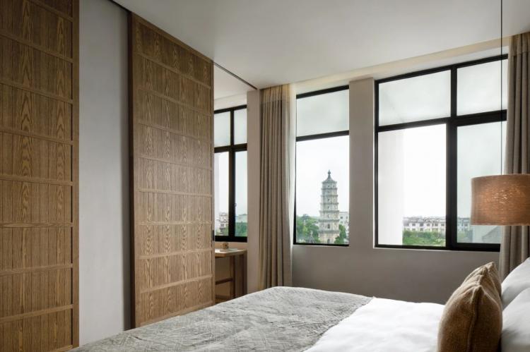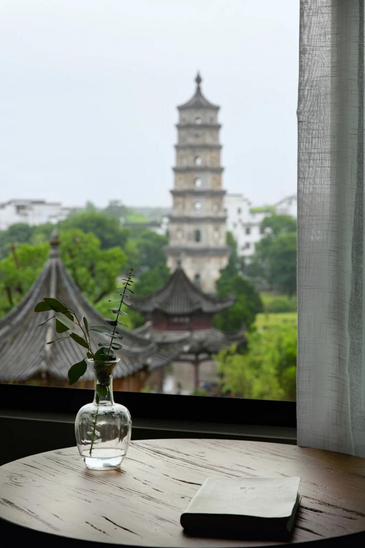 进入房间,便见塔身。如层层修心,此刻到达最高级。翼峰塔的塔影如日晷一般在潜口孤自转了四百多年,包裹着柔润的气韵,入窗而来,定下置身其中的静心基调。