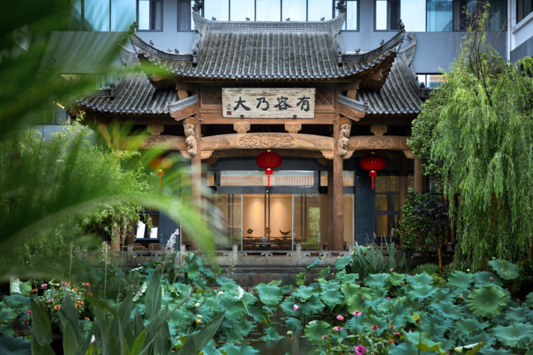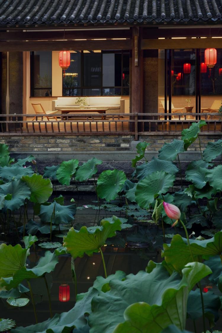 入口设计采用徽州经典亭榭,穿过水庭院,才能到达酒店大堂。这段不长不短的路程,便是「漫戈塔·天榕庄」为入定者准备的“ 洗尘仪式 ” 。当心中尘埃落定,方可下榻此处。
