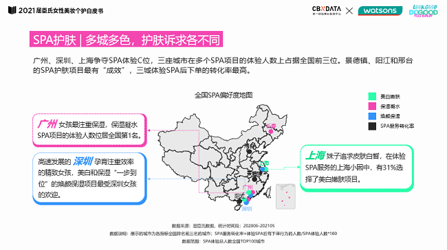 “试”出更好功效:白皮书显示过去一年参与屈臣氏SPA护肤项目的体验人数猛增,35%的消费者选择美白嫩肤。在这一个国民诉求之外,用户对功效的诉求依然呈现明显的地域特点:内蒙女性更关注补水,上海妹子更追求皮肤白皙,广州深圳女孩则更关注保湿。SPA护肤项目颇有成效,实现了屈臣氏消费者的皮肤状态越来越好,整体得分上涨2.9%,其中,皮肤抗敏感和色素分解度方面的改善最为明显。