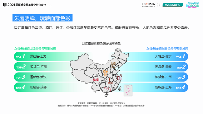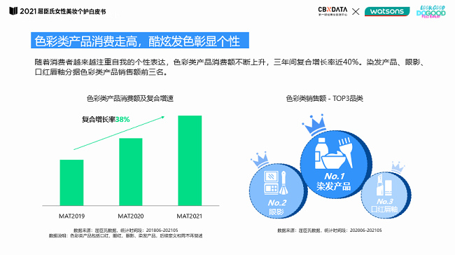 “试”出更潮色彩:有人追求细致护肤,有人尝试百变妆容。白皮书显示,色彩类产品消费额不断上升,三年间复合增长率近40%,染发产品、眼影、口红唇釉分据色彩类产品销售额前三名,其中染发类产品两年间的复合增长率近60%;口红唇釉红色当道,酒红、砖红、番茄红荣膺年度最受欢迎色号,眼影盘则百花齐放,大地色系和南瓜色系更受喜爱。