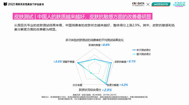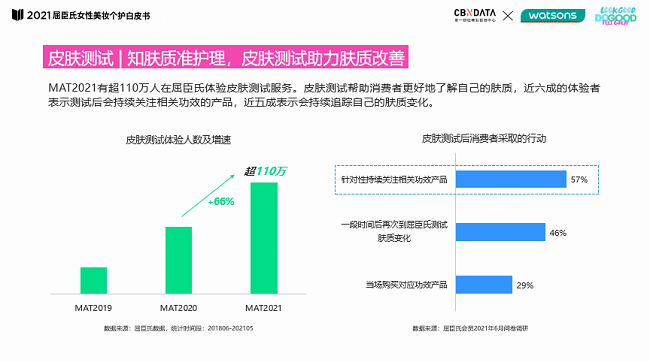 年轻用户的高接受度给新品牌、新产品、新功能的出现创造了市场。女性从过去简单粗暴的模式化护肤误区中走出来,力求“悦己”“尝新”“适合”。白皮书显示,过去一年有超110万人参与了屈臣氏的皮肤测试,超六成参与者后续持续关注相关功效产品,近五成会持续关注肤质变化。