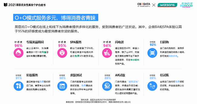 作为一家服务导向的健康美容零售商,屈臣氏提供闪电送、门店扫码自助购物、微信卡包免费预约彩妆免排队、门店免费皮肤测试、AR试妆及“无条件退货”的任试瓶在内的多元服务链接海量场景,获得消费者青睐,其中企微BA和SPA体验以高于95%的好感度成为最受消费者欢迎的服务。