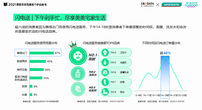 “试”出更好享受:宅家也要照美不误,屈臣氏企微BA为新奇“试”提供更惬意的居家变美咨询,其中北京使用企微BA服务的用户数最多,忙碌的深圳人更喜欢在夜间咨询企微BA。此外,闪电送大受欢迎,超六成的消费者因为懒得出门而使用闪电送服务,下午14-18时是消费者下单最频繁的时间段,面膜、洗发水和染发剂是最受欢迎的闪电送品类。