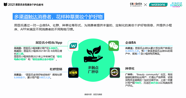 近几年屈臣氏广泛布局小程序/APP,BA企业微信、社群、种草社多个渠道进行品牌传播以增加用户群体总量,将所有用户沉淀至私域。