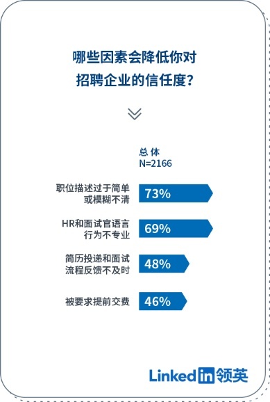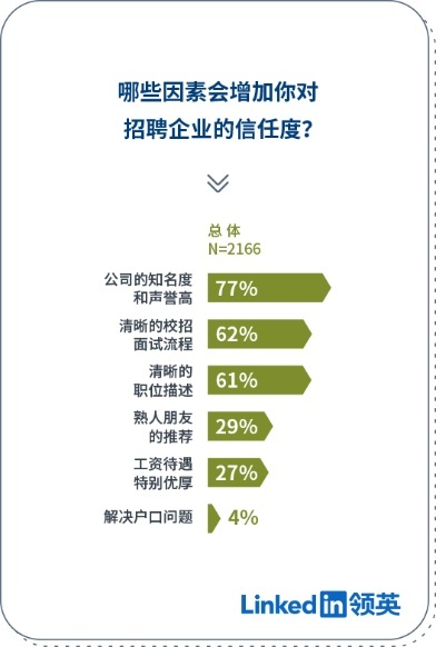 求职是一个“双向选择”的过程,而“建立信任”则是做出选择的第一步。从大学生求职者的视角来看,调研显示,知名度和雇主品牌声誉高的企业最受求职者信赖,其次是校招面试流程和职位描述是否清晰,这些因素的影响都远远高于“企业是否能提供优厚的工资待遇”。