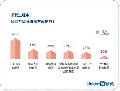 求职过程中,受访者表示最希望获得的信息是关于实际工作情况的信息,77%的受访者表示,希望在求职过程中能更多了解在职人员的工作体验,大家对此类信息的渴求远高于其他类型的信息,包括笔试面试经验(29%)。这或许也表明学生求职时越来越看重实际工作与自身的匹配度,而不仅仅是通过一次面试。