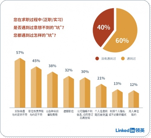 根据领英与瞭望智库联合发布的报告显示,有超过60%的受访者在求职过程中遇到过不同种类的“坑”。其中最常见的情况是“实际待遇与约定不符”,有超过半数的人遇到过这种情况,其次是“职位权责与约定不符”和“以各种名目骗取费用”,分别有45%和38%的人遇到过。在曾经遇到过“坑”的受访者中,有64%的人表示“想要进行维权”。