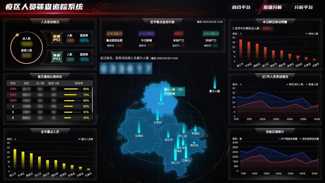 为助力政府对疫情的全面管理,做出科学、高效决策,2月1日,南威软件旗下大数据集团受政府委托,快速研发出疫区疫情人员追踪系统,利用大数据技术帮助筛查追踪疫区疫情人员,实现对人员的实时、全动态、多方位管理。平台利用数据抓取技术汇聚各地来泉信息,依托先进的大数据技术实现对海量数据的清洗、转换、整合与分析,形成多维度统计分析报表,包括区县每日新增来泉数据、每日离泉数据、滞留本市数据、重点地区每日新增及标准数据等;针对重点关注人员,通过设定电子围栏,实现人员的实时预警与精准定位;利用自主研发的数据融合平台进行数据汇聚融合,可视化报表分析提供疫情信息的实时动态全掌握,助力疫情防范单位做到疫情“科学防治、精准施措”。